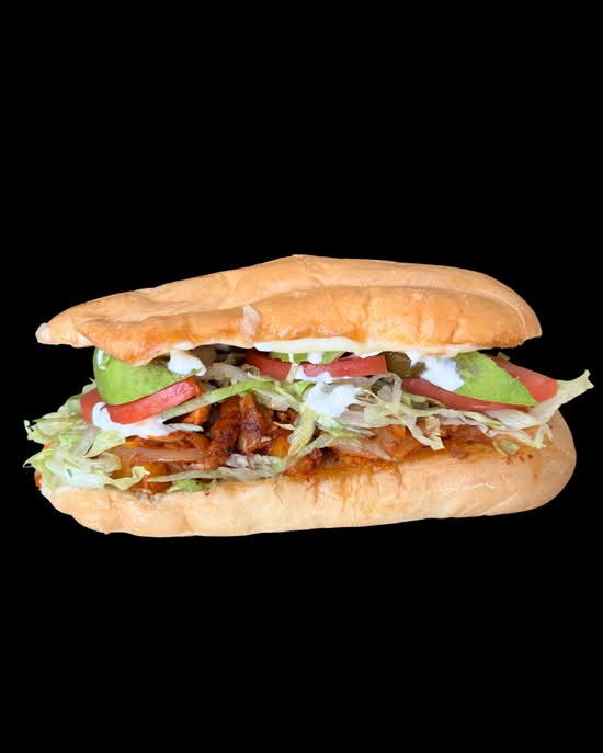 Traditional bread, mayo, beans, marinated pork, lettuce, tomatoes, avocado, sour cream, jalapeños, and fresh onion