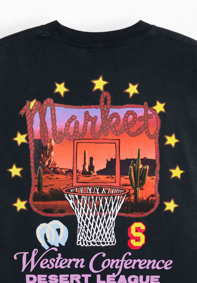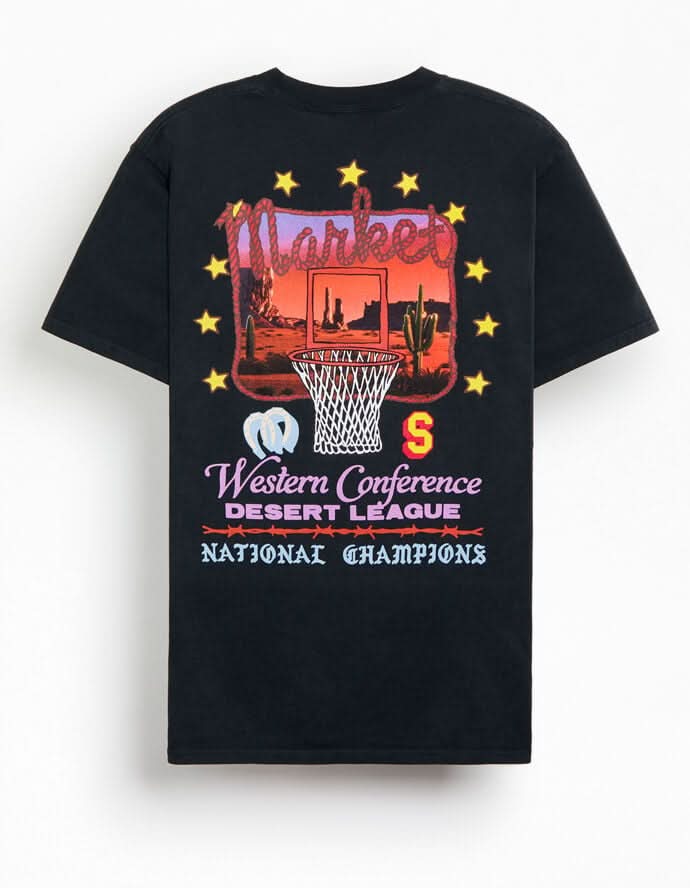 The Desert League T-Shirt from Market blends everyday style with a fun edge. Crafted in vintage wash fabric, this tee features graphics on the left chest and back. With short sleeves and a classic crew neckline, this tee is perfect for a laid-back, effortlessly cool look.Vintage wash tee Short sleeves Crew neckline Left chest & back graphics Standard fit Machine washable • Color: Black • Size: L