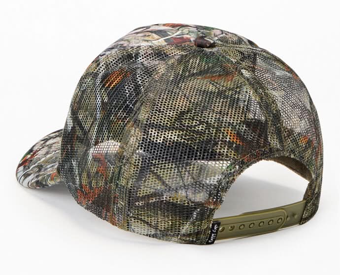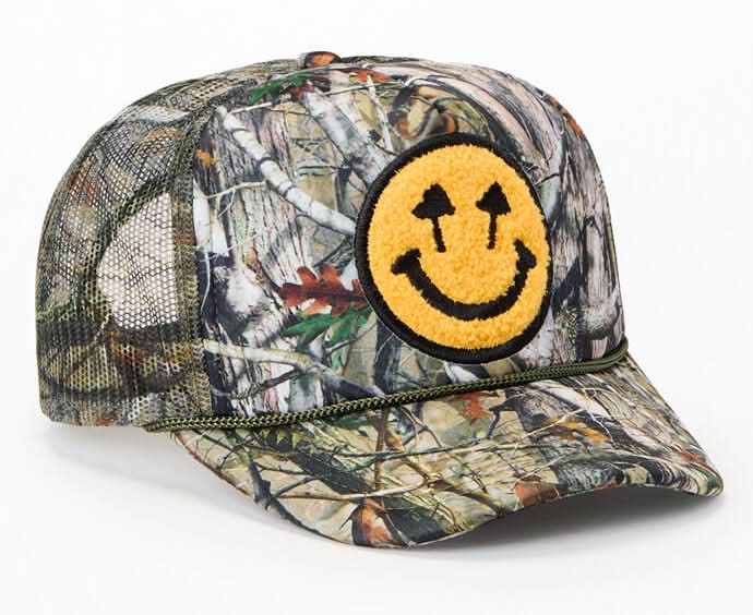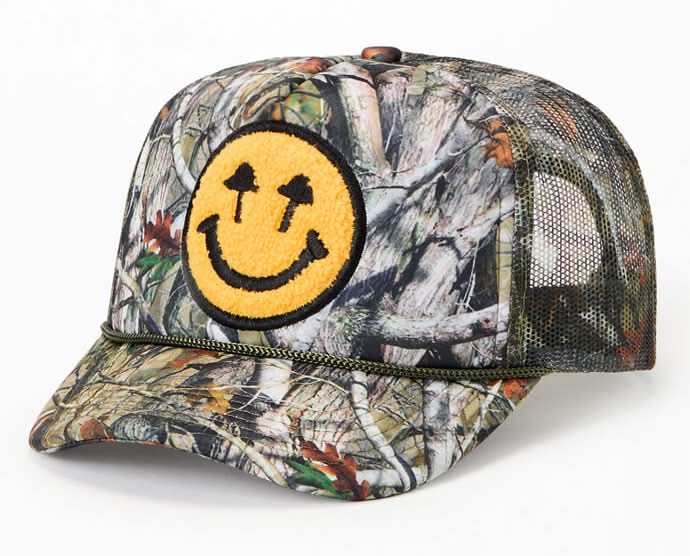 Stay edgy with rugged style in the Double Blind Camo Foam Trucker Hat from Happy Caps. Featuring a mesh back panel for breathability, a curved brim, rope trim, plus a camo print and happy face patch on the front, this snapback brings the perfect blend of fun and edgy style. Mesh back panel Camo print Front happy face patch Curved brim Rope trim Adjustable snapback closure • Color: Camouflage • Size: One Size