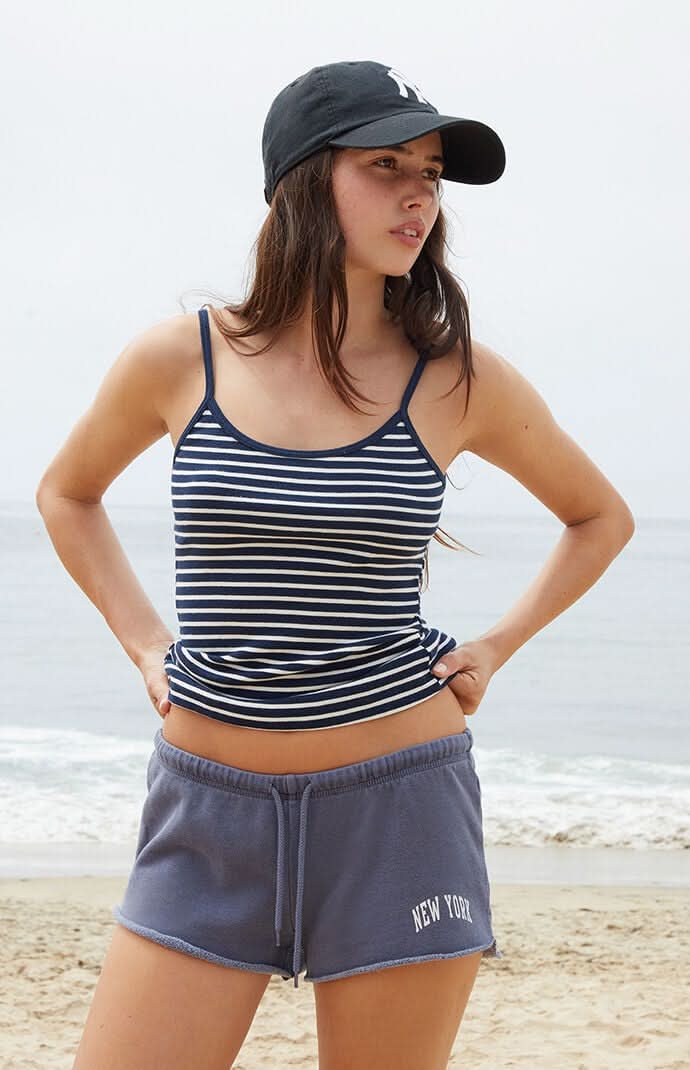The Marcie New York Sweat Shorts from John Galt combine cozy comfort with city-inspired style. They feature a soft fleece lining, low-rise fit, drawstring waistband, raw cut hems, relaxed fit, and a bold New York graphic at the hem.8" rise2.5" inseamSolid color sweat shortsSoft fleece liningLow-riseDrawstring waistbandNew York graphic at hemRaw cut hemsRelaxed fit85% cotton, 15% polyesterMachine washableFits size 23" - 25" waistModel measurements: 5’5” height, 30” bust, 24” waist, 31” hip • Color: Dark blue • Size: One Size