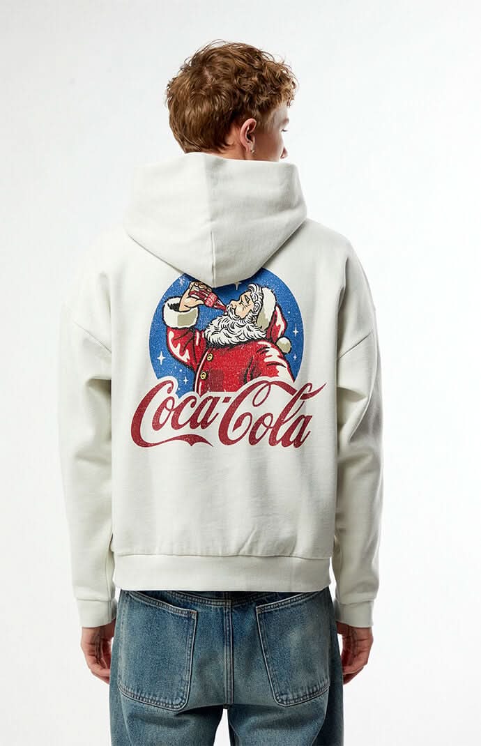 Get into the holiday spirit with the Coca-Cola By Pacsun Snowglobe Hoodie. Made with long sleeves, an attached hood, ribbed trimming and a kangaroo pocket, this hoodie features iconic Coca-Cola graphics of Santa Claus on the left chest and back for a standout streetwear look with a holiday touch. Solid color hoodie Long sleeves Attached hood Soft fleece lining Ribbed trimming Coca-Cola graphics Kangaroo pocket 80% cotton, 20% polyester Machine washable Model is wearing a size mediumModel Measurements: 6’2” Height, 39” Chest, 35” Waist, 32” Inseam • Color: Cream • Size: M