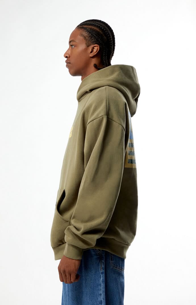 The Core Co-Op Flag Hoodie blends cozy comfort with a bold style. This hoodie features soft fleece lining, long sleeves, an attached hood, a kangaroo pocket, and front puff graphics along with a back flag graphic, and ribbed cuffs and hem making it perfect for cooler weather. Solid color hoodie Soft fleece lining Long sleeves Attached hood Kangaroo pocket Ribbed cuffs and hem Heavyweight fabrication Front puff graphics Back flag graphic Standard fit 75% cotton, 25% polyester Machine washable Model is wearing a size large Model Measurements: 6’1.5” Height, 36” Chest, 31.5” Waist, 33.5” Hips, 34” Inseam • Color: Olive • Size: L