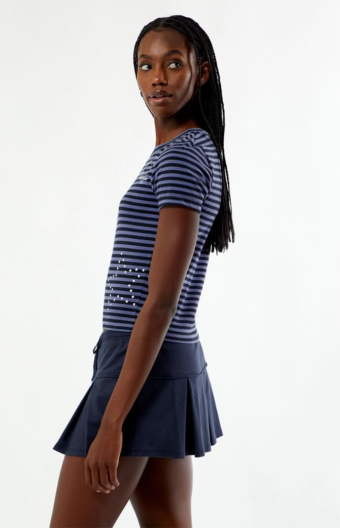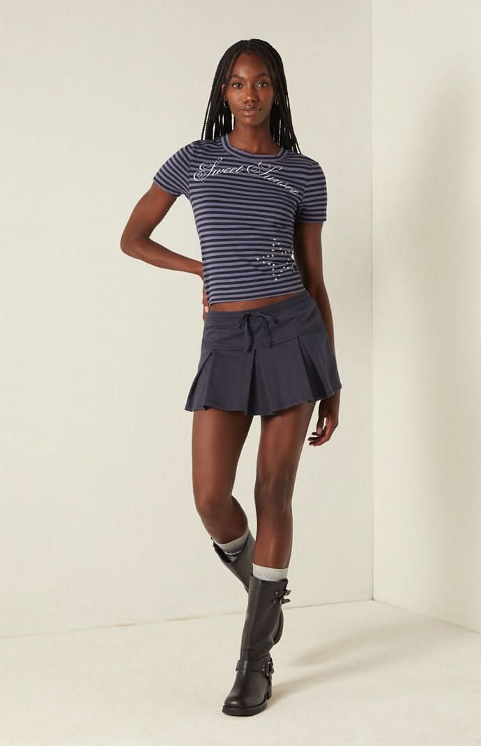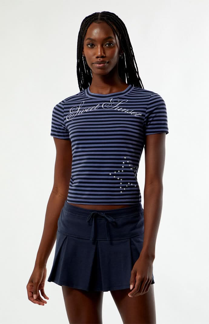 The Sweet Sunset Striped Skimmer T-Shirt from Your Favorite adds a playful, flirty twist to a classic striped tee. Featuring short sleeves, a crew neckline, a “Sweet Sunset” front graphic, and star-studded detail at the hem, this slim-fit skimmer balances everyday comfort with standout style.Striped teeShort sleevesCrew necklineSweet Sunset front graphicStar studied detail at hemSlim fit100% cottonMachine washableModel is wearing a size smallModel measurements: 5’10” height, 31.5” bust, 24” waist, 35” hips • Color: Black • Size: XS