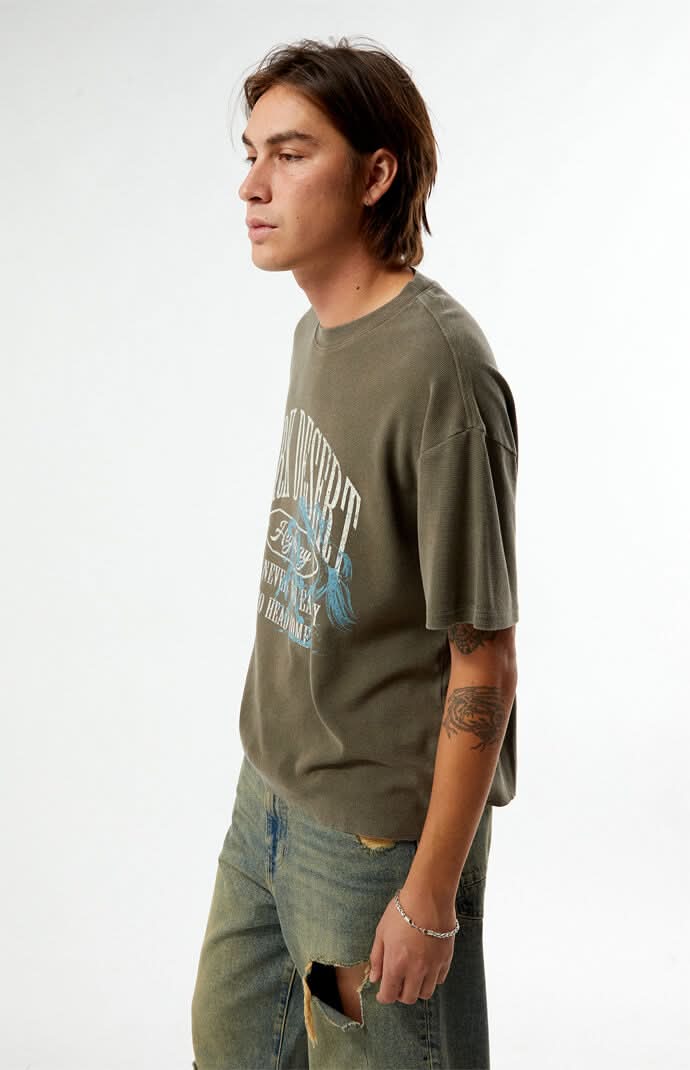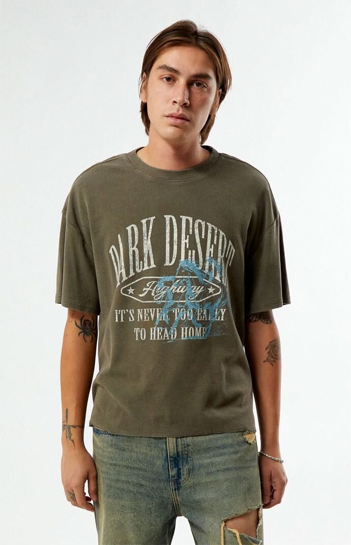 The Dark Desert Waffle Knit T-Shirt from Pacsun brings texture and style to your everyday wardrobe. Made with waffle knit fabric, this tee features a crew neckline, short sleeves, a raw hem and standout graphics printed on the front for a bold touch. Solid color tee Waffle knit fabric Crew neckline Short sleeves Front graphics Raw hem Standard fit 100% Cotton Machine washable Model is wearing a size mediumModel Measurements: 6’1” Height, 32” Chest, 30” Waist, 36 Suit • Color: Brown • Size: XL