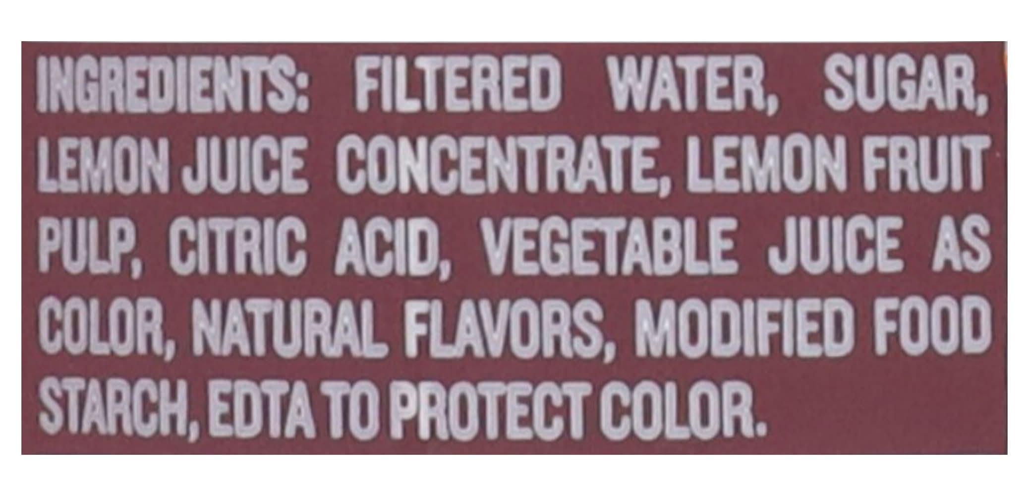Ingredients: Filtered Water, Sugar, Lemon Juice Concentrate, Lemon Fruit Pulp, Citric Acid, Vegetable Juice as Color, Natural Flavors, Modified Food Starch, EDTA to Protect Color