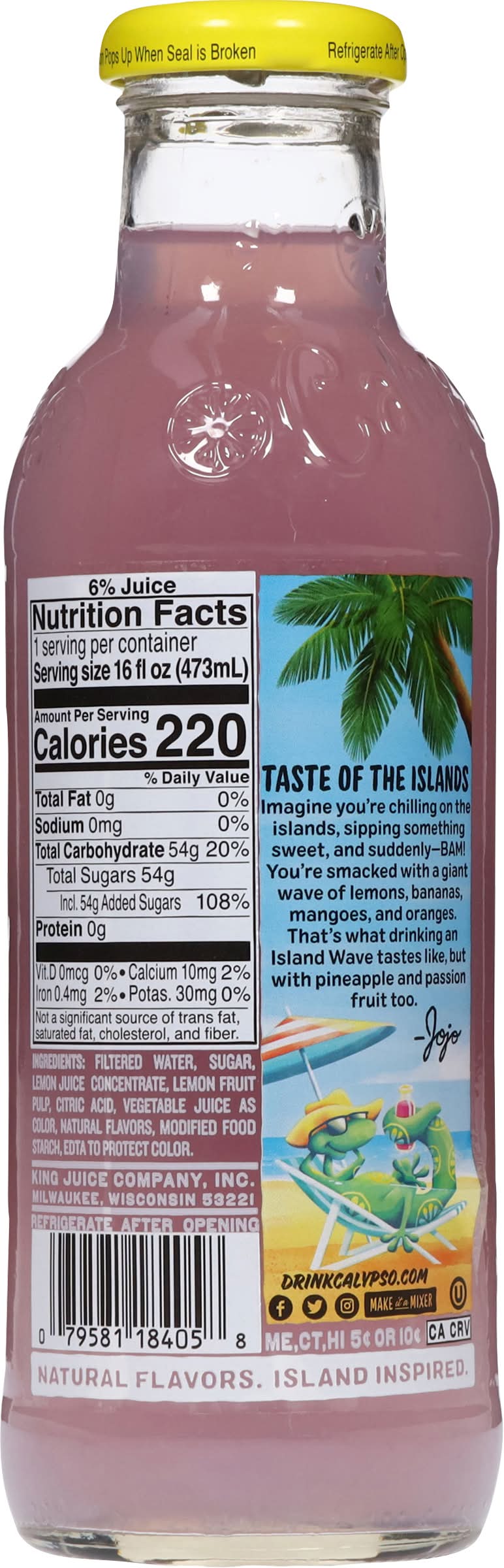 With other natural flavors. Natural flavors. Real lemon bits. Taste of the Islands: Imagine you're chilling on the islands, sipping something sweet, and suddenly - bam! You're smacked with a giant wave of lemons, bananas, mangoes, and oranges. That's what drinking an Island Wave tastes like, but with pineapple and passion fruit too. • Flavor: Island wave • King Juice Company, Inc., Milwaukee, WI, 53221