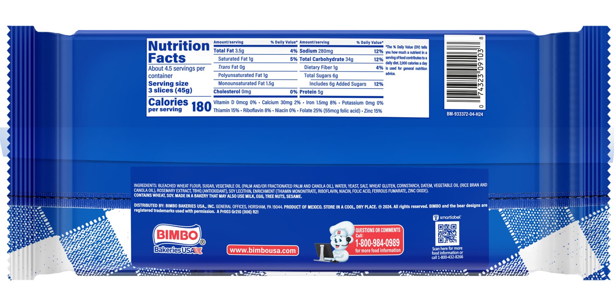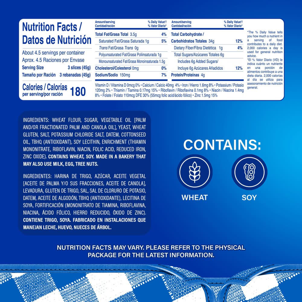 Ingredients: BLEACHED WHEAT FLOUR, SUGAR, VEGETABLE OIL (PALM AND/OR FRACTIONATED PALM AND CANOLA OIL), WATER, YEAST, SALT, WHEAT GLUTEN, DATEM, VEGETABLE OIL (RICE BRAN AND CANOLA OIL), ROSEMARY EXTRACT, ANTIOXIDANT [TBHQ], SOY LECITHIN, ENRICHMENT [THIAMIN MONONITRATE, RIBOFLAVIN, NIACIN, FOLIC ACID, FERROUS FUMARATE, ZINC OXIDE], . Contains: CONTAINS SOY, WHEAT.