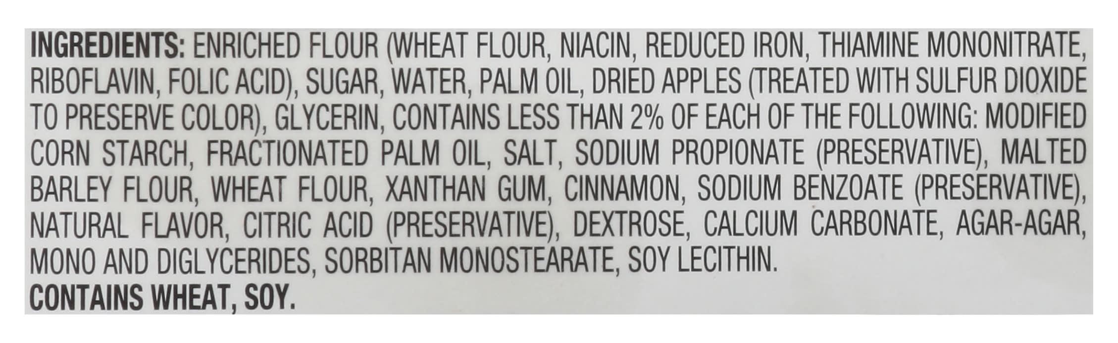 Ingredients: Enriched Flour (Wheat Flour, Niacin, Reduced Iron, Thiamine Mononitrate, Riboflavin, Folic Acid), Sugar, Water, Palm Oil, Dried Apples (Treated with Sulfur Dioxide to Preserve Color), Glycerin, Contains Less than 2% of Each of the Following: Modified Corn Starch, Fractionated Palm Oil, Salt, Sodium Propionate (Preservative), Malted Barley Flour, Wheat Flour, Xanthan Gum, Cinnamon, Sodium Benzoate (Preservative), Natural Flavor, Citric Acid (Preservative), Dextrose, Calcium Carbonate, Agar-Agar, Mono and Diglycerides, Sorbitan Monostearate, Soy Lecithin Contains: Wheat, Soybeans, Corn, Barley