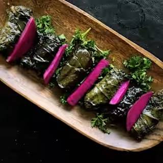 7 pieces of marinated grape leaves stuffed with basmati rice & seasoned with dill and tomato.