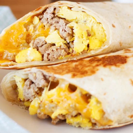 Breakfast burritos are large 12" flour tortillas filled with scrambled eggs, cheese, and your