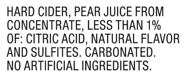 Ingredients: Hard Cider, Pear Juice from Concentrate, Less than 1% of: Citric Acid, Natural Flavor and Sulfites, Carbonated, No Artificial Ingredients Contains: Sulfites