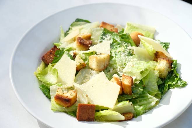 Romaine lettuce, Caesar dressing, and shaved parmesan cheese.