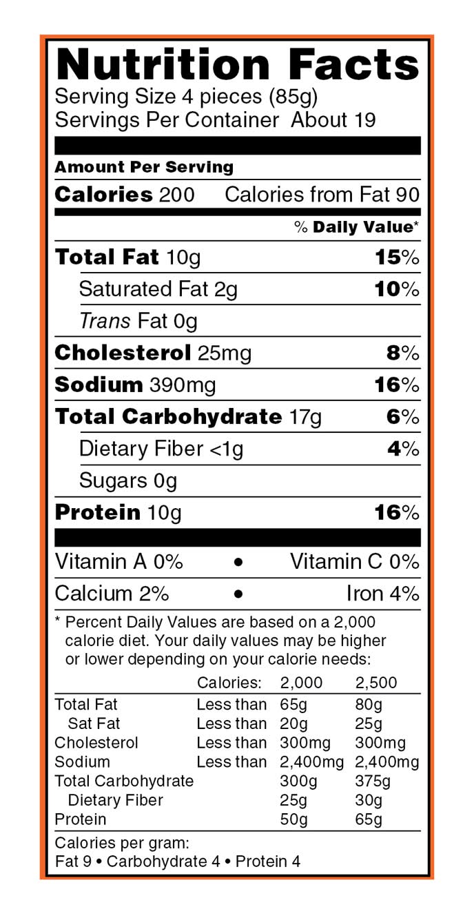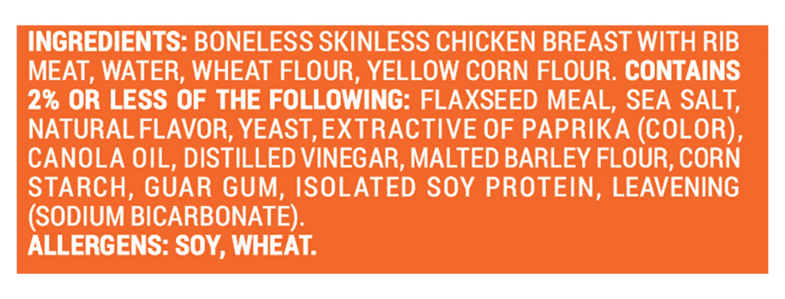 Ingredients: Boneless Skinless Chicken Breast with Rib Meat, Water, Wheat Flour, Yellow Corn Flour, Contains 2% or Less of the Following: Flaxseed Meal, Sea Salt, Natural Flavor, Yeast, Extractive of Paprika (Color), Canola Oil, Distilled Vinegar, Malted Barley Flour, Corn Starch, Guar Gum, Isolated Soy Protein, Leavening (Sodium Bicarbonate) Contains: Wheat, Soybeans, Corn, Barley