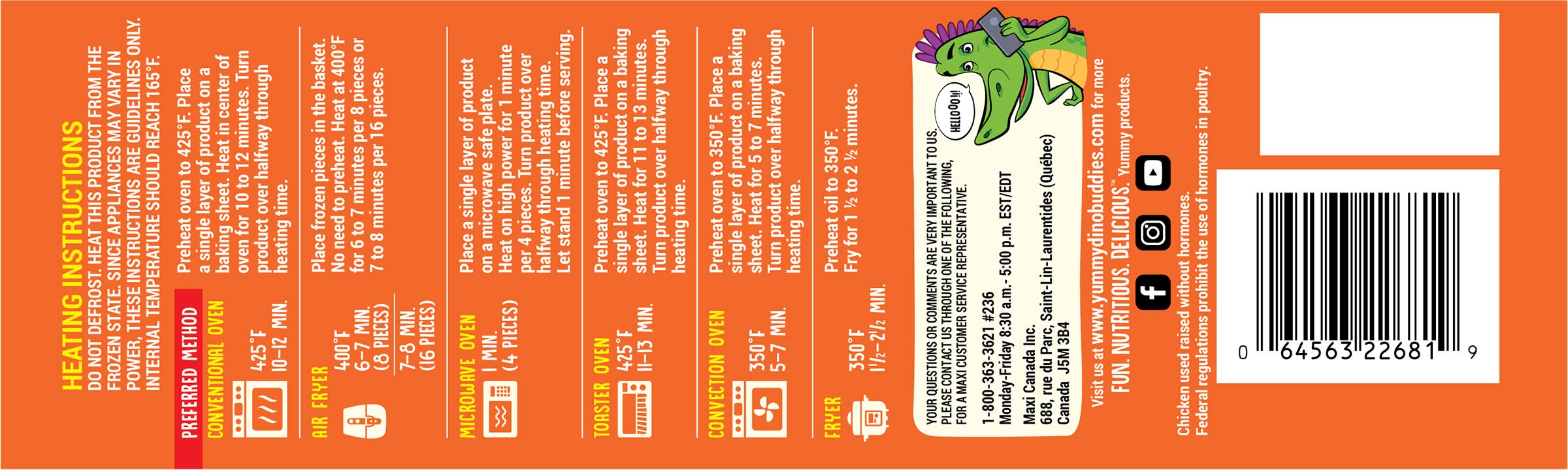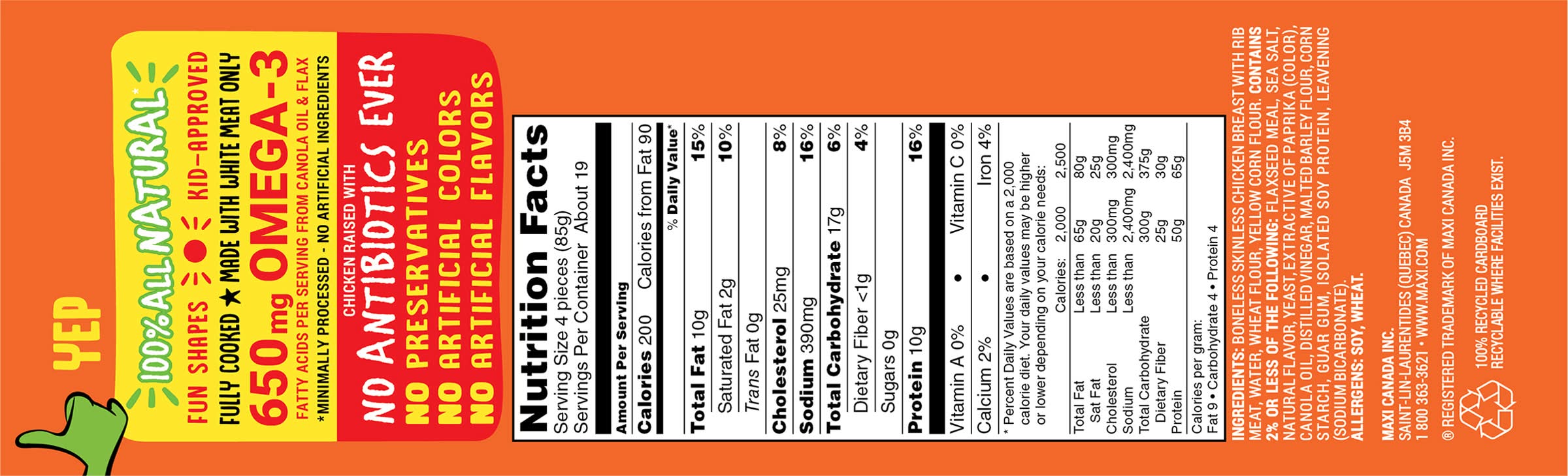 Chicken breast patty fritters with rib meat. No artificial ingredients, flavors, colors, and no preservatives. 650 mg omega-3 fatty acids per serving from canola oil & flax. 10 g protein per serving. Fun nutritious delicious. Chicken raised with no antibiotics ever. Fully cooked. Microwaveable. Chicken used raised without hormones. Federal regulations prohibit the use of hormones in poultry. Yep. Fun shapes kid-approved. No preservatives. No artificial colors. • Number of servings: 20 • Maxi Canada Inc., Saint-Lin-Laurentides, Quebec, J5M 3B4 • Packaging: Reusable