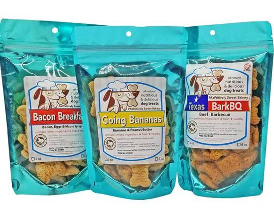 Includes Bacon Breakfast (bacon, eggs & maple syrup) biscuits, 4 oz; Going Bananas (bananas & peanut butter) biscuits, 4 oz; and Texas BarkBQ (beef bbq) biscuits, 4 oz. We use only human-grade ingredients, without artificial flavors, preservatives, or fillers. All our pet food products are prepared on shared equipment that uses peanut oil and peanuts.