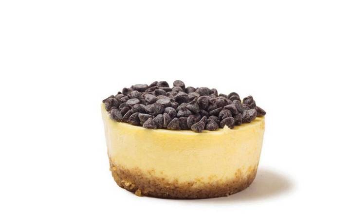 A rich and creamy cheesecake served in a perfectly portioned cup and topped with chocolate chocolate chips.