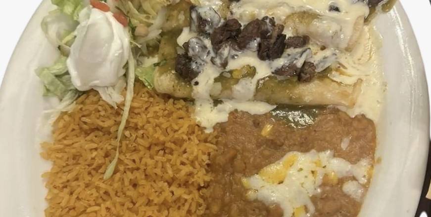 Three cheese enchiladas with your choice of meat; served with rice and beans, lettuce, sour cream and pico de gallo, topped with cheese dip and red or green salsa.