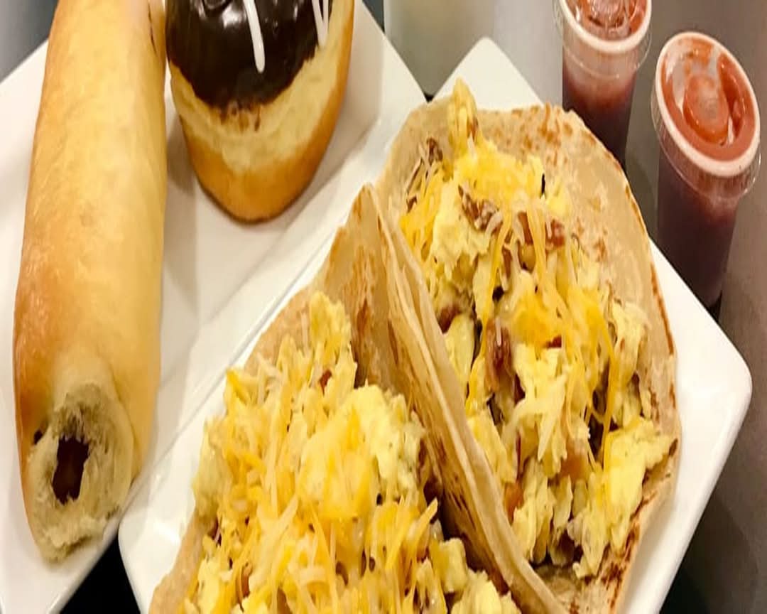 Smoked BBQ brisket, pico de gallo, queso fresco, and BBQ sauce on a corn tortilla.Breakfast Sandwiches