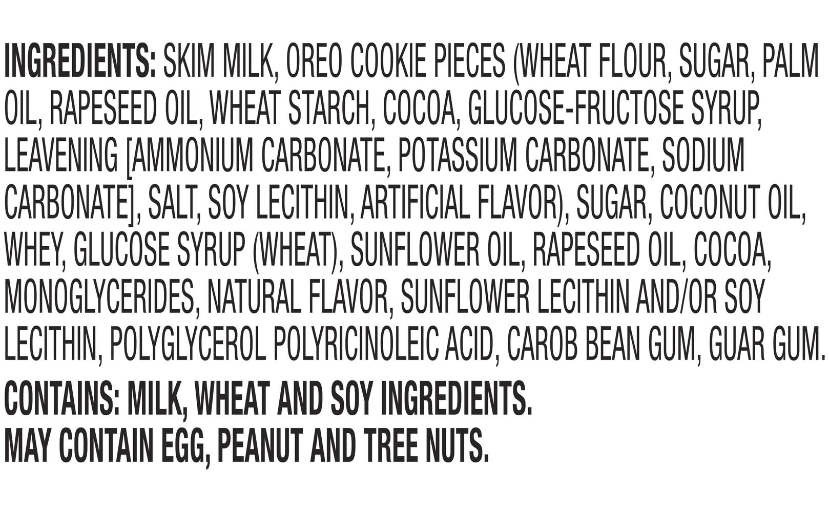 Ingredients: SKIM MILK, OREO COOKIE PIECES (WHEAT FLOUR, SUGAR, PALM OIL, RAPESEED OIL, WHEAT STARCH, COCOA, GLUCOSE-FRUCTOSE SYRUP, LEAVENING [AMMONIUM CARBONATE, POTASSIUM CARBONATE, SODIUM CARBONATE], SALT, SOY LECITHIN, ARTIFICIAL FLAVOR), SUGAR, COCONUT OIL, WHEY, GLUCOSE SYRUP (WHEAT), SUNFLOWER OIL, RAPESEED OIL, COCOA, MONOGLYCERIDES, NATURAL FLAVOR, SUNFLOWER LECITHIN AND, OR SOY LECITHIN, POLYGLYCEROL POLYRICINOLEIC ACID, CAROB BEAN GUM, GUAR GUM. Contains: Milk, Wheat, Soy, Egg, Peanut, Tree Nuts
