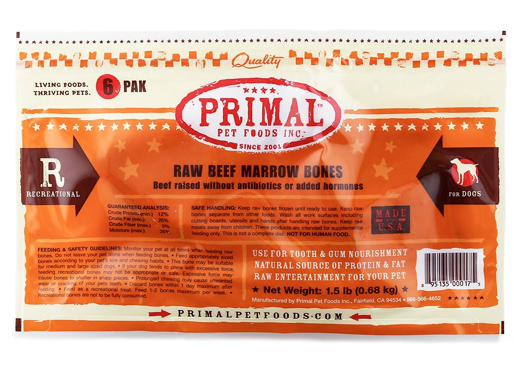 Primal Raw Frozen Recreational Beef Marrow Bones for Dogs & Cats (6 ct)