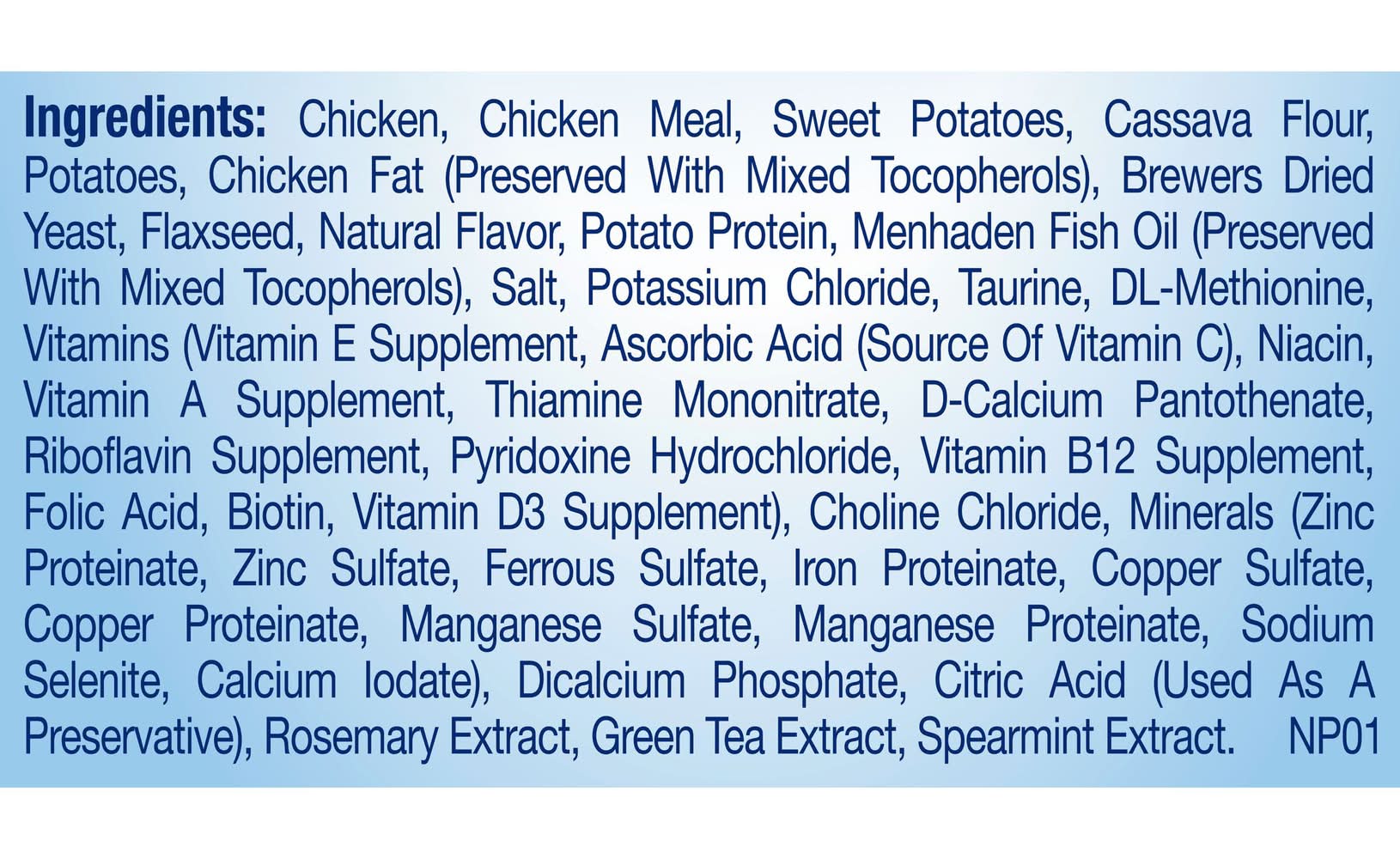 Ingredients: Chicken, Chicken Meal, Sweet Potatoes, Cassava Flour, Potatoes, Chicken Fat (Preserved with Mixed Tocopherols), Brewers Dried Yeast, Flaxseed, Natural Flavor, Potato Protein, Menhaden Fish Oil (Preserved with Mixed Tocopherols), Salt, Potassium Chloride, Taurine, DL-Methionine, Vitamins (Vitamin E Supplement Ascorbic Acid (Source of Vitamin C), Niacin, Vitamin A Supplement, Thiamine Mononitrate, D-Calcium Pantothenate, Riboflavin Supplement, Pyridoxine Hydrochloride, Vitamin B12 Supplement, Folic Acid, Biotin, Vitamin D3 Supplement), Choline Chloride, Minerals (Zinc Proteinate Zinc Sulfate Ferrous Sulfate Iron Proteinate Copper Sulfate Copper Proteinate Manganese Sulfate Manganese Proteinate Sodium Selenite Calcium Iodate), Dicalcium Phosphate, Citric Acid (Used as a Preservative), Rosemary Extract, Green Tea Extract, Spearmint Extract Contains: Fish