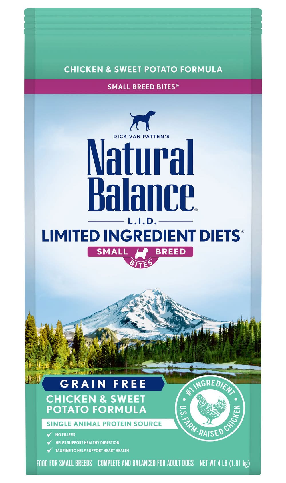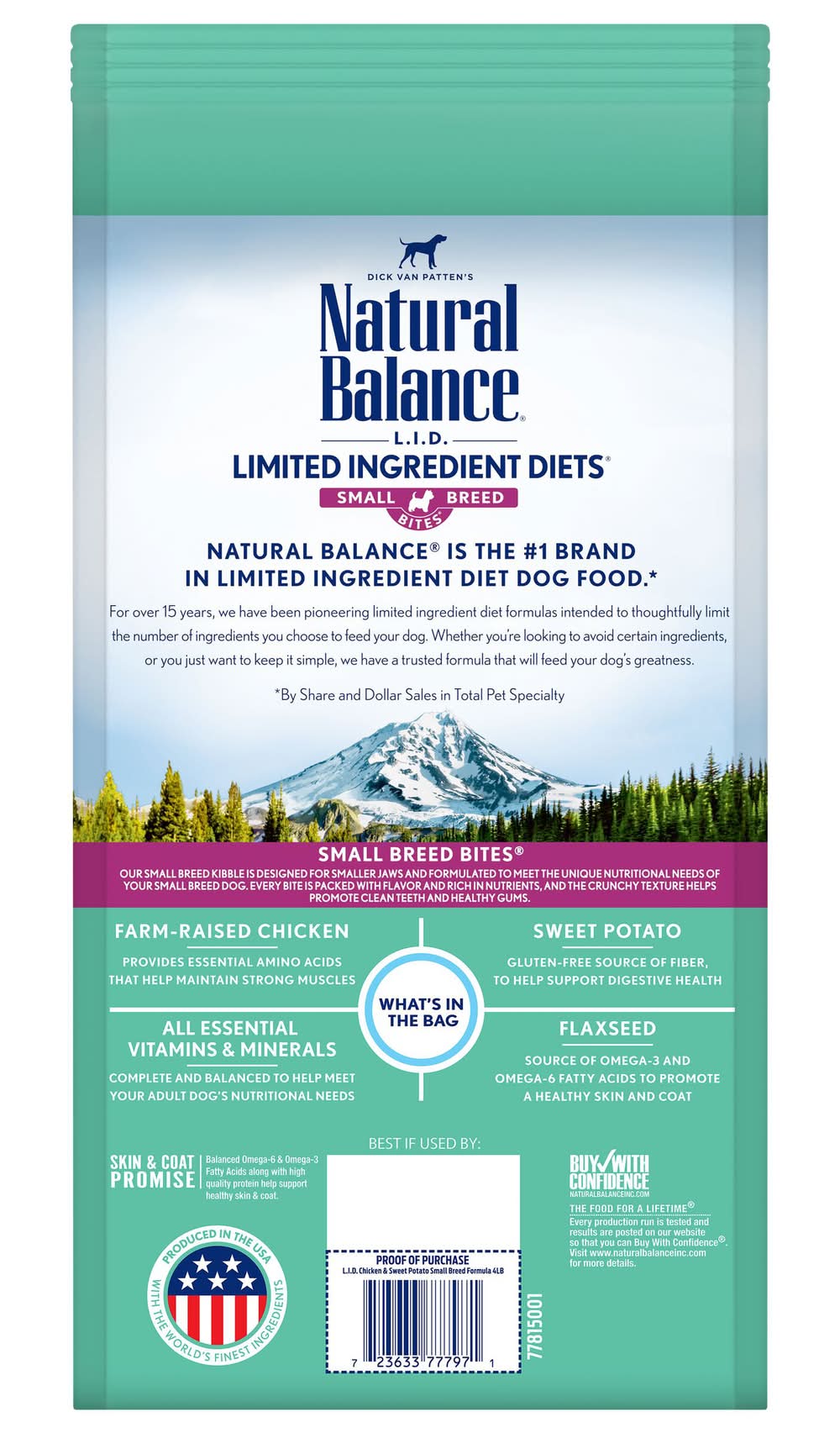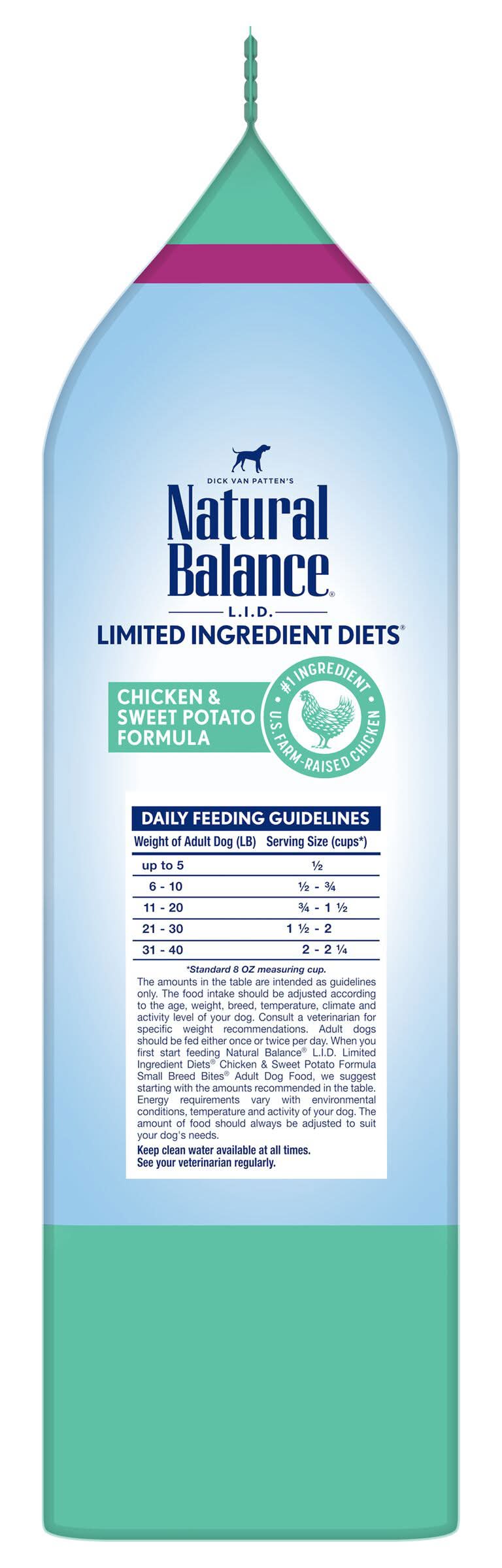 Dick Van Patten's Natural Balance LID. Limited Ingredients Diets Chicken & Sweet Potato Formula Small breed bites adult dog Food is formulated to meet the nutritional levels established by the Association of American Feed Control Officials (AAFCO) Dog Food Nutrient Profiles for Adult Maintenance No artificial preservatives, flavors, or colors. Single animal protein source. No fillers. Helps support healthy digestion. Taurine to help support heart health. Food for small breeds. Complete and balanced for adult dogs. No.1 ingredient US farm-raised chicken. What’s in the Bag: Farm-Raised Chicken: Provides essential amino acids that help maintain strong muscles. Sweet Potato: Gluten-free source of fiber, to help support digestive health. All Essential vitamins & Minerals: Complete and balanced to help meet your adult dog’s nutritional needs. Flaxseed: Source of Omega-6 and Omega-3 fatty acids to help promote a healthy skin and coat. Skin & Coat Promise: Balanced Omega-6 & Omega-3 fatty acids along with high quality protein help support healthy skin & coat. Buy with Confidence. The food for a lifetime. Every production run is tested and results are posted on our website so that you can buy with confidence. Small Breed Bites: our small breed kibble is designed for smaller jaws and formulated to meet the unique nutritional needs of your small breed dog. Every bite is packed with flavor and rich in nutrients, and the crunchy texture helps promote clean teeth and healthy gums. 100% satisfaction guaranteed.