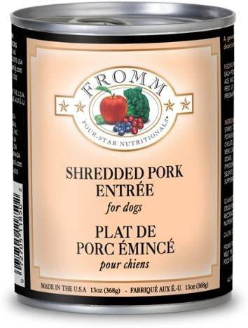 A generous portion of shredded pork cooked in pork broth with potatoes, carrots, and beans|Fromm Family Foods is a fifth generation family-owned-and-operated artisan pet food company|Produced at Fromm's hands-on family-owned-and-operated facility|Interchangable with other Four-Star can and dry recipes|Delicious shredded muscle meat Crude Protein: 7%; Crude Fat (Min): 3.5%; Crude Fiber (Max): 1.5%; Moisture (Max): 82%; *Frommbalaya™ Chicken; Vegetable; & Rice Stew Food For Dogs Is Formulated To Meet The Nutritional Levels Established By The AAFCO Dog Food Nutrient Profiles For All Life Stages; Including Growth Of Large Size Dogs (70 Lbs. Or More As An Adult). Pack size: 12