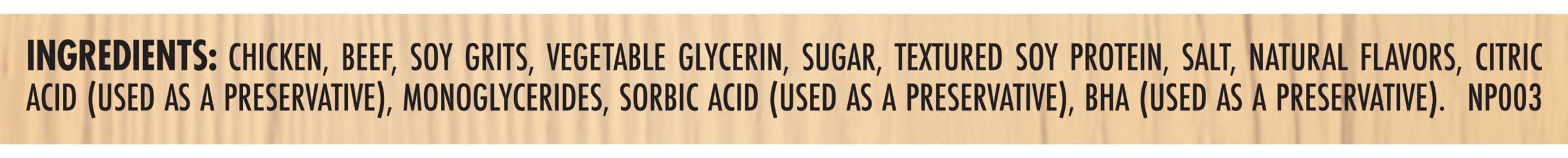 Ingredients: Chicken, Beef, Soy Grits, Vegetable Glycerin, Sugar, Textured Soy Protein, Salt, Natural Flavors, Citric Acid (Used As A Preservative), Monoglycerides, Sorbic Acid (Used As A Preservative), Bha (Used As A Preservative)