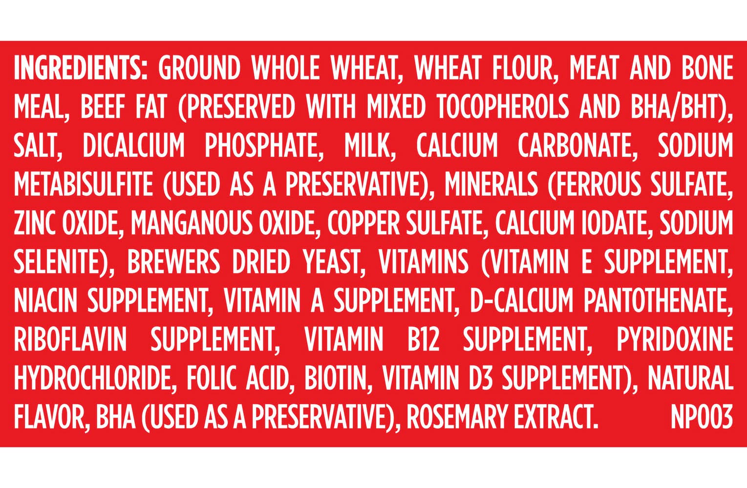 Ingredients: Ground Whole Wheat, Wheat Flour, Meat And Bone Meal, Beef Fat (Preserved With Bha And Mixed Tocopherols), Salt, Bone Phosphate, Milk, Calcium Carbonate, Malted Barley Flour, Sodium Metabisulfite (Used As A Preservative), Minerals (Ferrous Sulfate, Zinc Oxide, Manganous Oxide, Copper Sulfate, Calcium Iodate, Sodium Selenite), Brewers Dried Yeast, Natural Flavor, Vitamins (Vitamin E Supplement, Niacin Supplement, Vitamin A Supplement, D-Calcium Pantothenate, Riboflavin Supplement, Vitamin B12 Supplement, Pyridoxine Hydrochloride, Folic Acid, Biotin, Vitamin D3 Supplement), Bha (Used As A Preservative), Mixed Tocopherols (Used As A Preservative), Rosemary Extract