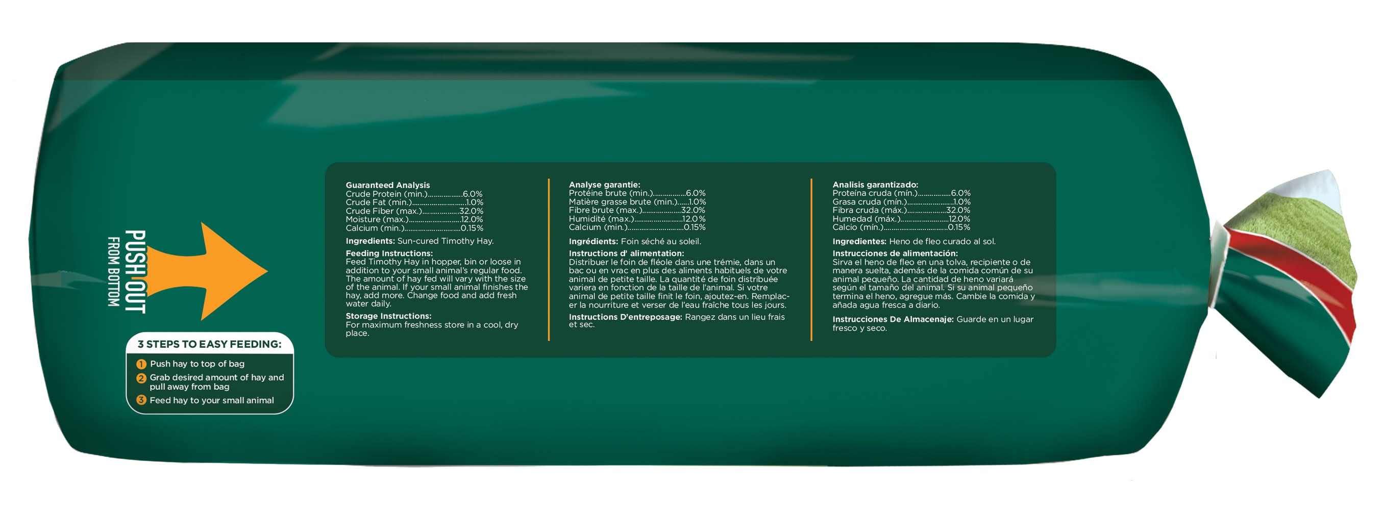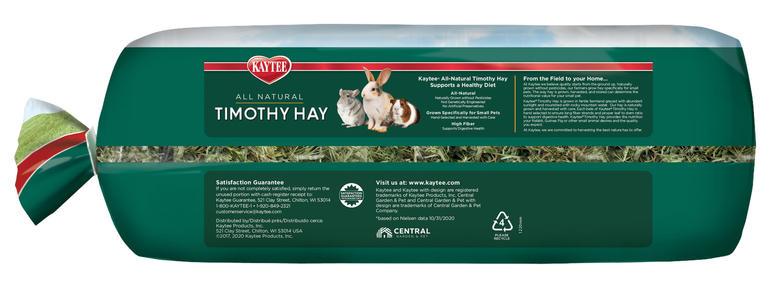 Directions: provide kaytee timothy hay in a feed hopper, bin or loose. the amount offered will vary with the size of the animal. small animals benefit from timothy hay as a fiber source, chewing material to discourage hairballs, and as a nesting material. change food and add fresh water daily.