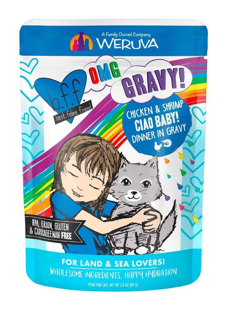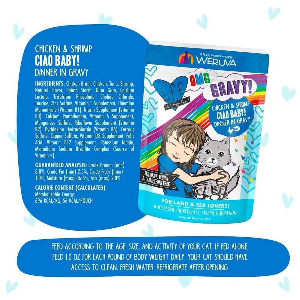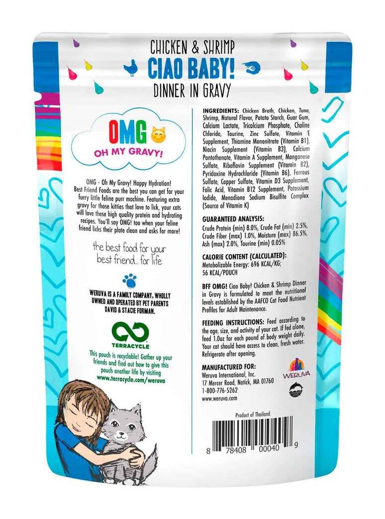 Ciao Baby! (2.8oz Pouch, Pack of 12) Red-meat tuna, cage-free chicken, and shrimp in a tasty gravy.|B.F.F. OMG - Your Best Feline Friend will love these extra juicy flavors. Oh my Gravy!|With even more gravy, and tender pieces of chicken - B.F.F. provides all the lean protein and moisture your cat needs to thrive.|Grain-free, Gluten-free, & Carrageenan-free. No corn, wheat or soy. Free from any artificial colors & preservatives|Produced in Human Food Facilities under the Strictest B.R.C. Global Standards for Food Crude Protein (Min): 8.0%; Crude Fat (Min): 2.5%; Crude Fiber (Max): 1.0%; Moisture (Max): 86.5%; Ash (Max): 3.0%; Taurine (Min): 0.05%;