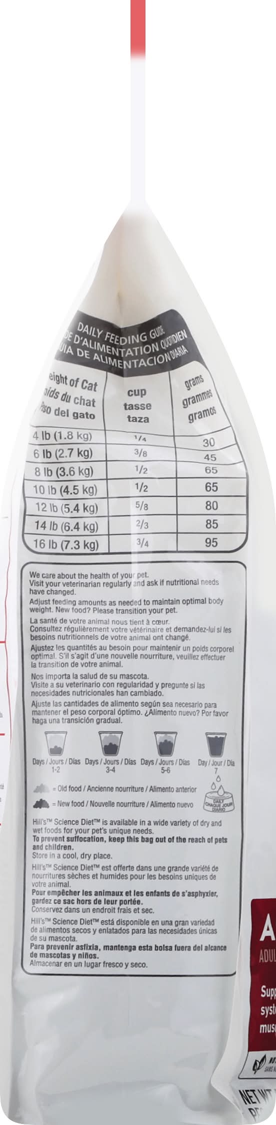 Directions for use: Usage of instructions:Daily Feeding Guide: 4 lb (1.8 kg) weight of cat; 1/4 cup; 30 grams. 6 lb (2.7 kg) weight of cat; 3/8 cup; 45 grams. 8 lb (3.6 kg) weight of cat; 1/2 cup; 65 grams. 10 lb (4.5 kg) weight of cat; 1/2 cup; 65 grams. 12 lb (5.4 kg) weight of cat; 5/8 cup; 80 grams. 14 lb (6.4 kg) weight of cat; 2/3 cup; 85 grams. 16 lb (7.3 kg) weight of cat; 3/4 cup; 95 grams. We care about the health of your pet. Visit your veterinarian regularly and ask if nutritional needs have changed. Adjust feeding amounts as needed to maintain optimal body weight. New food? Please transition your pet. Hill's Science Diet is available in a wide variety of dry and wet foods for your pet's unique needs. - Directions: aily Feeding Guide: 4 lb (1.8 kg) weight of cat; 1/4 cup; 30 grams. 6 lb (2.7 kg) weight of cat; 3/8 cup; 45 grams. 8 lb (3.6 kg) weight of cat; 1/2 cup; 65 grams. 10 lb (4.5 kg) weight of cat; 1/2 cup; 65 grams. 12 lb (5.4 kg) weight of cat; 5/8 cup; 80 grams. 14 lb (6.4 kg) weight of cat; 2/3 cup; 85 grams. 16 lb (7.3 kg) weight of cat; 3/4 cup; 95 grams. We care about the health of your pet. Visit your veterinarian regularly and ask if nutritional needs have changed. Adjust feeding amounts as needed to maintain optimal body weight. New food? Please transition your pet. Hill's Science Diet is available in a wide variety of dry and wet foods for your pet's unique needs. Store in a cool, dry place. Storage recommendation: Store in a cool, dry place.
