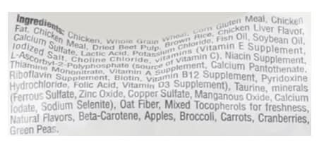 Ingredients: Chicken, Whole Grain Wheat, Corn Gluten Meal, Chicken Fat, Chicken Meal, Dried Beet Pulp, Brown Rice, Chicken Liver Flavor, Calcium Sulfate, Lactic Acid, Potassium Chloride, Fish Oil, Soybean Oil, Iodized Salt, Choline Chloride, Vitamins (Vitamin E Supplement, L-Ascorbyl-2-Polyphosphate (Source of Vitamin C), Niacin Supplement, Thiamine Mononitrate, Vitamin A Supplement, Calcium Pantothenate, Riboflavin Supplement, Biotin, Vitamin B12 Supplement, Pyridoxine Hydrochloride, Folic Acid, Vitamin D3 Supplement), Taurine, Minerals (Ferrous Sulfate, Zinc Oxide, Copper Sulfate, Manganous Oxide, Calcium Iodate, Sodium Selenite), Oat Fiber, Mixed Tocopherols for Freshness, Natural Flavors, Beta-Carotene, Apples, Broccoli, Carrots, Cranberries, Green Peas