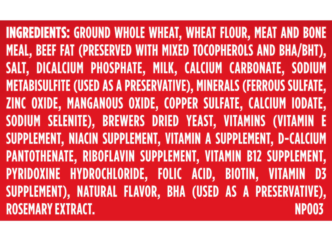 Ingredients: Ground Whole Wheat, Wheat Flour, Meat And Bone Meal, Beef Fat (Preserved With Mixed Tocopherols And Bha/BHT), Salt, Dicalcium Phosphate, Milk, Calcium Carbonate, Sodium Metabisulfite (Used As A Preservative), Minerals (Ferrous Sulfate, Zinc Oxide, Manganous Oxide, Copper Sulfate, Calcium Iodate, Sodium Selenite), Brewers Dried Yeast, Vitamins (Vitamin E Supplement, Niacin Supplement, Vitamin A Supplement, D-Calcium Pantothenate, Riboflavin Supplement, Vitamin B12 Supplement, Pyridoxine Hydrochloride, Folic Acid, Biotin, Vitamin D3 Supplement), Natural Flavor, Bha (Used As A Preservative), Rosemary Extract.
