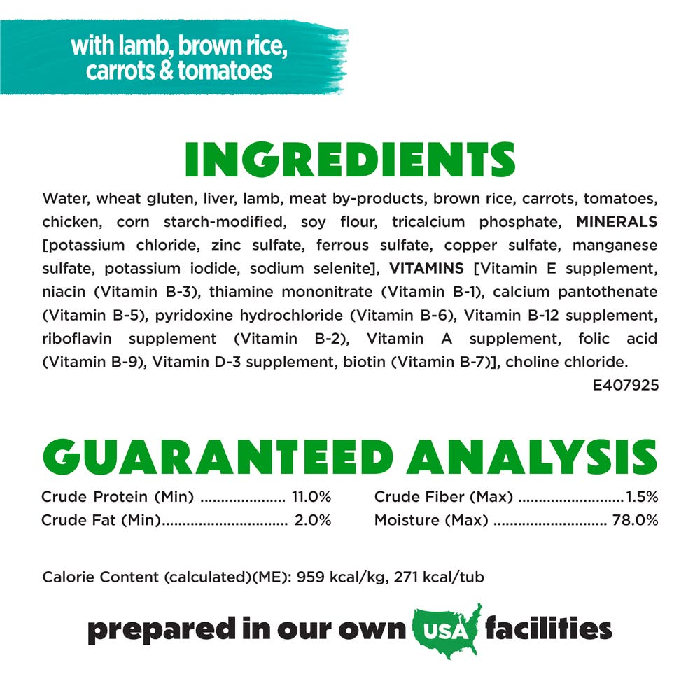 Ingredients: Water, Wheat Gluten, Liver, Lamb, Meat By-Products, Brown Rice, Carrots, Tomatoes, Chicken, Corn Starch-Modified, Soy Flour, Tricalcium Phosphate, MINERALS [Potassium Chloride, Zinc Sulfate, Ferrous Sulfate, Copper Sulfate, Manganese Sulfate, Potassium Iodide, Sodium Selenite], VITAMINS [Vitamin E Supplement, Niacin (Vitamin B-3), Thiamine Mononitrate (Vitamin B-1), Calcium Pantothenate (Vitamin B-5), Pyridoxine Hydrochloride (Vitamin B-6), Vitamin B-12 Supplement, Riboflavin Supplement (Vitamin B-2), Vitamin A Supplement, Folic Acid (Vitamin B-9), Vitamin D-3 Supplement, Biotin (Vitamin B-7)], Choline Chloride.\tE407925 Contains: Wheat, Gluten, Soybeans