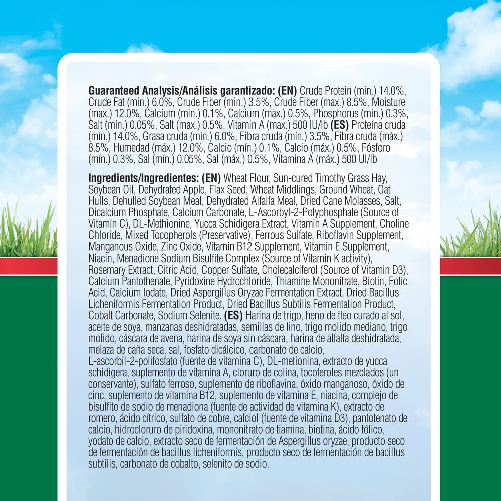 Ingredients: Wheat Flour, Sun-cured Timothy Grass Hay, Soybean Oil, Dehydrated Apple, Flax Seed, Wheat Middlings, Ground Wheat, Oat Hulls, Dehulled Soybean Meal, Dehydrated Alfalfa Meal, Dried Cane Molasses, Salt, Dicalcium Phosphate, Calcium Carbonate, L-Ascorbyl-2-Polyphosphate (Source of Vitamin C), DL-Methionine, Yucca Schidigera Extract, Vitamin A Supplement, Choline Chloride, Mixed Tocopherols (Preservative), Ferrous Sulfate, Riboflavin Supplement, Manganous Oxide, Zinc Oxide, Vitamin B12 Supplement, Vitamin E Supplement, Niacin, Menadione Sodium Bisulfite Complex (Source of Vitamin K activity), Rosemary Extract, Citric Acid, Copper Sulfate, Cholecalciferol (Source of Vitamin D3), Calcium Pantothenate, Pyridoxine Hydrochloride, Thiamine Mononitrate, Biotin, Folic Acid, Calcium Iodate, Dried Aspergillus oryzae Fermentation Extract, Dried Bacillus licheniformis Fermentation Product, Dried Bacillus subtilis Fermentation Product, Cobalt Carbonate, Sodium Selenite.