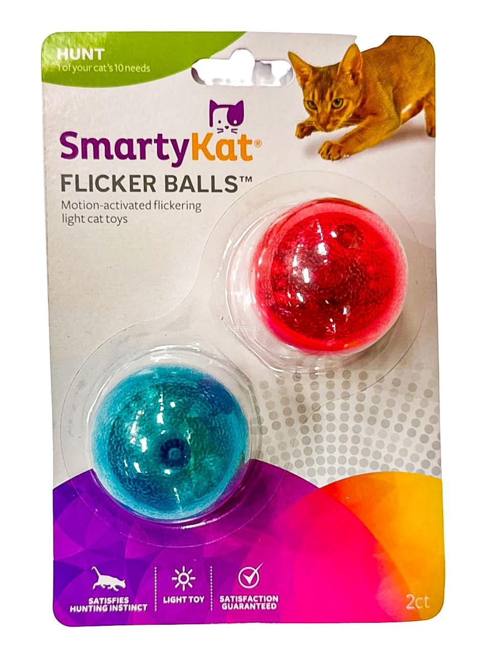 SmartyKat Flicker Balls Set of 2 Electronic Light Ball Cat Toys activate the thrill of the chase! An intriguing spin on the ever-popular cat ball, this motion-activated light up ball will roll on carpeting as well as hard surfaces and will have cats chasing and toying with it. Every swat of the pawsends the ball flickering and rolling. Hunting cat toys help satisfy a cat's natural desire with kinder prey.