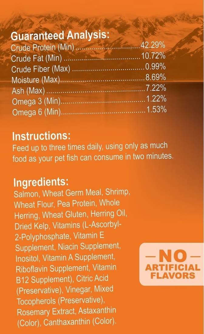 Made with fresh shrimp caught directly from Alaskan Fisherman|Shrimp are 100% food grade and loaded with natural color enhancers and delicious, cold-water proteins|Rich in omega 3 & 6 HUFA's for healthy immune systems and long life|Natural pigments in salmon skins improve and promote vibrant colors|100% Made in the USA Crude Protein 38.0% min, Crude Fat 10.0% min, Crude Fiber 2.0% max, Moisture 8.5% max, Ash 8.0% max
