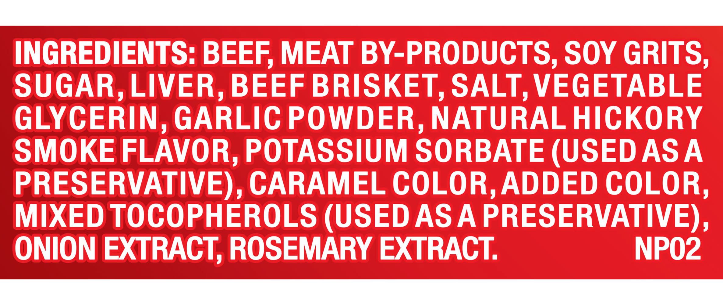 Ingredients: Beef, Meat By-products, Soy Grits, Sugar, Liver, Beef Brisket, Salt, Vegetable Glycerin, Garlic Powder, Natural Hickory Smoke Flavor, Potassium Sorbate (used As A Preservative), Caramel Color, Added Color, Mixed Tocopherols (used As A Preservative), Onion Extract, Rosemary Extract Contains: Soybeans