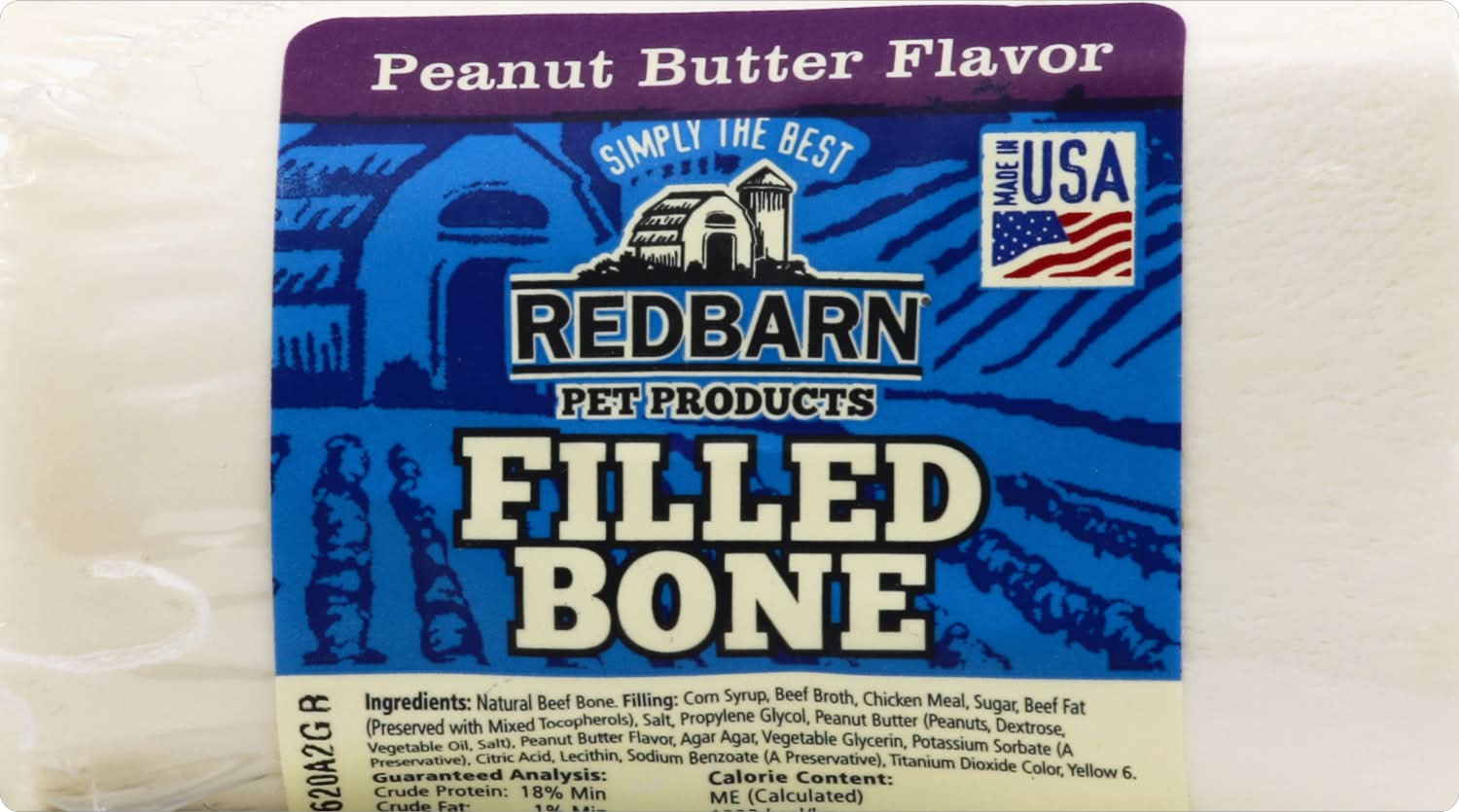 Ingredients: Natural Beef Bone. Filling: Corn Syrup, Beef Broth, Chicken Meal, Sugar, Beef Fat (Preserved with Mixed Tocopherols), Salt, Propylene Glycol, Peanut Butter (Peanuts, Dextrose, Vegetable Oil, Salt), Peanut Butter Flavor, Agar Agar, Vegetable Glycerin, Potassium Sorbate (a Preservative), Citric Acid, Lecithin, Sodium Benzoate (a Preservative), Titanium Dioxide Color, Yellow 6 Contains: Peanuts