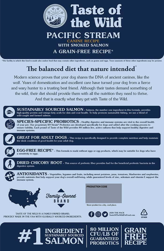 Salmon, the number one ingredient in this recipe, provides high-quality protein and omega fatty acids for skin and coat health|This recipe is made without eggs or egg products, which may be suitable for dogs who have a sensitivity to eggs|A complete diet formulated without grains and with no artificial colors, flavors or preservatives added. Includes 80 million CFU/lb probiotics guaranteed for digestive support|Taste of the Wild is a family-owned company, and every recipe is made in the USA with high-quality ingredients from carefully vetted sources around the globe|Taste Of The Wild recipes are produced in a facility that manufactures products with grains, so while it’s unlikely, there may be trace amounts of grain or egg in Taste of the Wild products Crude Protein: 25.0 %; Crude Fat (Min): 15.0%; Crude Fiber (Max): 3.0%; Moisture (Max): 10.0%imum Zinc (Min): 150 Mg/Kg; Selenium 0.35 Mg/Kg; Vitamin E 150 Iu/Kg; Taurine* 0.12%; Omega6 Fatty Acids* 2.4%; Omega3 Fatty Acids* 0.3%; Total Microorganisms* (Lactobacillus Plantarum; Bacillus Subtilis; Lactobacillus Acidophilus; Enterococcus Faecium; Bifidobacterium Animalis) (Not Less Than): 80,000,000 CFU/lb; *Not Recognized As An Essential Nutrient By The AAFCO Dog Food Nutrient Profiles.