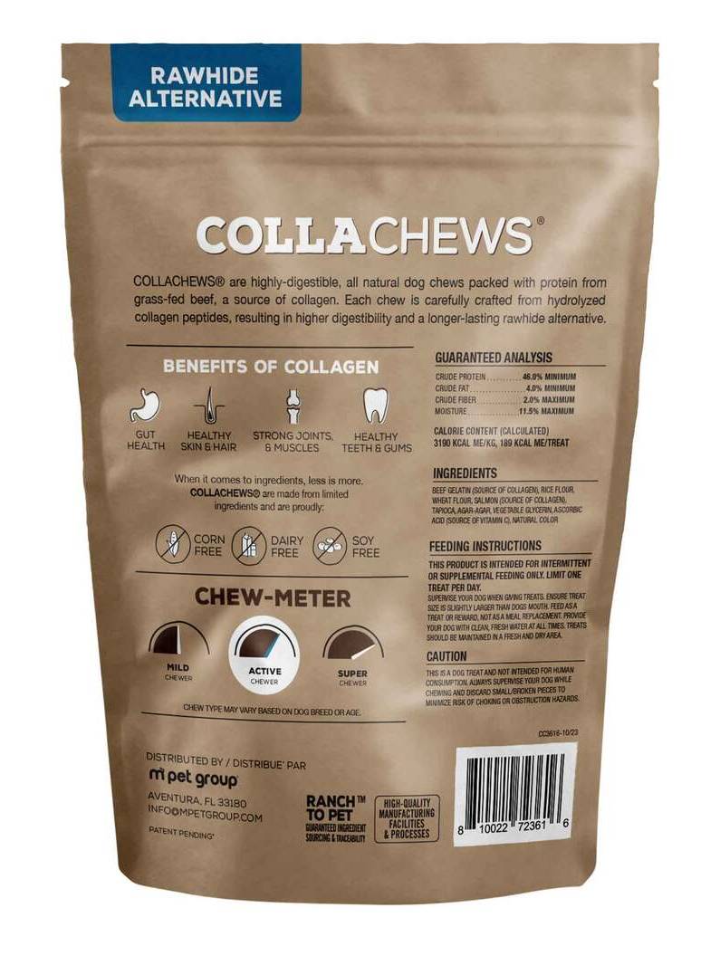 High-Quality Ingredients: Each TRURANCH Collagen Stick is made with real beef, chicken, bully, and salmon providing a scrumptious and safe alternative to rawhide. Free from dairy, soy, and corn, these treats are designed for all dogs, especially those with food sensitivities.|Enhances Health: Packed with natural ingredients and beef gelatin, a rich source of collagen, our sticks help maintain strong joints and muscles, promote gut health, and assist in cleaning teeth while the natural fibers help enhance digestion.|Allergy-Friendly Formula: Crafted without common allergens, our collagen sticks are perfect for dogs of all breeds and sizes. The absence of dairy, soy, and corn makes these chews a safe choice for dogs with specific dietary requirements.|Supports Dental Hygiene: The unique texture of the TRURANCH Collagen Sticks helps scrape away plaque and tartar build-up, promoting healthy teeth and gums. Regular chewing helps keep your dog's breath fresher and dental health in check.|Available in Various Sizes: Whether you have a small or large dog, our medium and large packs are ideal for tailoring to your dog's size and chewing habits, ensuring a satisfying and long-lasting chew experience. Crude Protein: 46% Min / Crude Fat 4% Min / Crude Fiber 2% Max / Moisture 11.5% Max / Calorie Content: 3192 KCAL ME/KG, 188 KCAL ME/TREAT