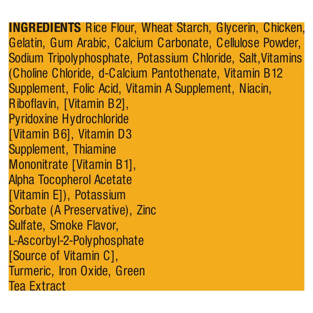 Ingredients: Rice Flour, Wheat Starch, Glycerin, Chicken, Gelatin, Gum Arabic, Calcium Carbonate, Cellulose Powder, Sodium Tripolyphosphate, Potassium Chloride, Salt, Vitamins (Choline Chloride, D-Calcium Pantothenate, Vitamin B12 Supplement, Folic Acid, Vitamin A Supplement, Niacin, Riboflavin, [Vitamin B2], Pyridoxine Hydrochloride [Vitamin B6], Vitamin D3 Supplement, Thiamine Mononitrate [Vitamin B1], Alpha Tocopherol Acetate [Vitamin E]), Potassium Sorbate (a Preservative), Zinc Sulfate, Smoke Flavor, L-Ascorbyl-2-Polyphosphate [Source of Vitamin C], Turmeric, Iron Oxide, Green Tea Extract Contains: Wheat