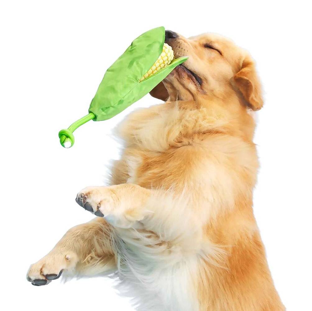 Grab the bull by the corns. It's time to play tug! This corn on the cob dog toy is stuffed with crazy crinkle and squeaks, and the sturdy nylon rope makes for fun fetching and fussing. Pups will also love the whippable husks which are a-maizing for thrashing! Size: M