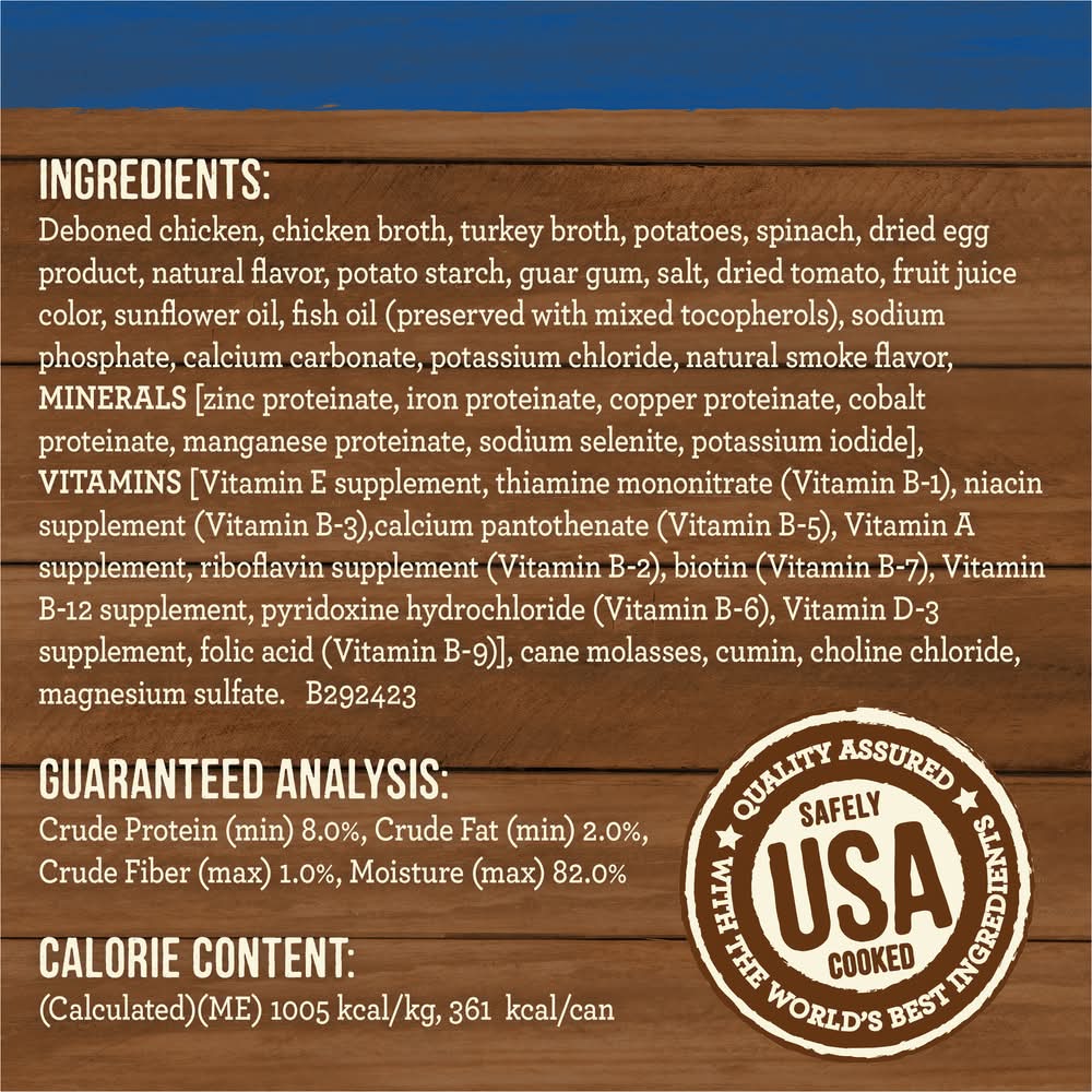 Ingredients: Deboned Chicken, Chicken Broth, Turkey Broth, Potatoes, Spinach, Dried Egg Product, Natural Flavor, Potato Starch, Guar Gum, Salt, Dried Tomato, Fruit Juice Color, Sunflower Oil, Fish Oil (Preserved With Mixed Tocopherols), Sodium Phosphate, Calcium Carbonate, Potassium Chloride, Natural Smoke Flavor, MINERALS [Zinc Proteinate, Iron Proteinate, Copper Proteinate, Cobalt Proteinate, Manganese Proteinate, Sodium Selenite, Potassium Iodide], VITAMINS [Vitamin E Supplement, Thiamine Mononitrate (Vitamin B-1), Niacin Supplement (Vitamin B-3),Calcium Pantothenate (Vitamin B-5), Vitamin A Supplement, Riboflavin Supplement (Vitamin B-2), Biotin (Vitamin B-7), Vitamin B-12 Supplement, Pyridoxine Hydrochloride (Vitamin B-6), Vitamin D-3 Supplement, Folic Acid (Vitamin B-9)], Cane Molasses, Cumin, Choline Chloride, Magnesium Sulfate. B292423