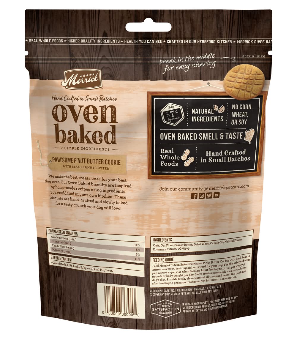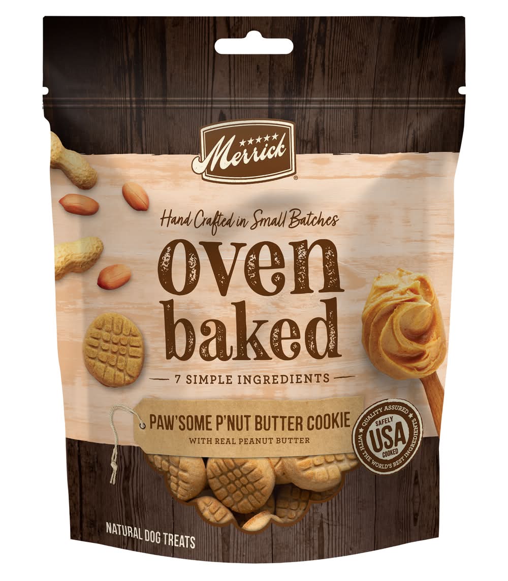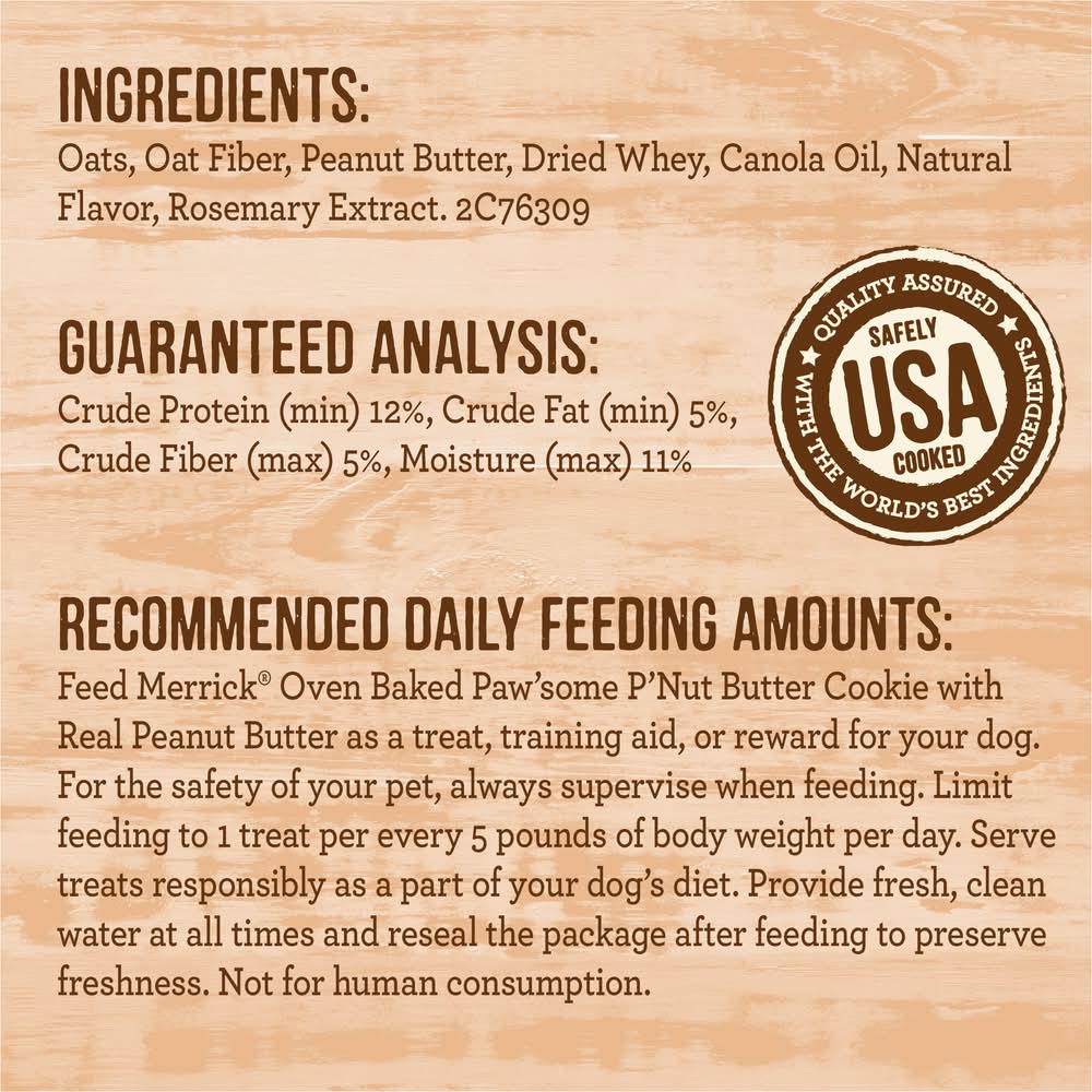 Merrick Oven Baked Paw’some P’nut Butter Cookie Dog Treats are inspired by homemade recipes using ingredients you could find in your own kitchen. Hand crafted in small batches, these natural dog treats offer a delicious, oven baked smell and taste that your dog will love. These oven baked dog treats are crafted with only 7 real, natural ingredients to make limited ingredient dog treats that let you share something delicious with your best friend. Among the natural ingredients in these crunchy dog treats, you'll find real whole foods, like real peanut butter for dog treats with a delicious flavor. Hand crafted in fun shapes, these Merrick dog treats are oven baked for a tasty crunch with each bite. These peanut butter dog treats are crafted without corn, soy or wheat and have no artificial colors, flavors, preservatives or by-products. All Merrick dog treats recipes are proudly founded in Hereford, Texas, crafted in USA facilities.