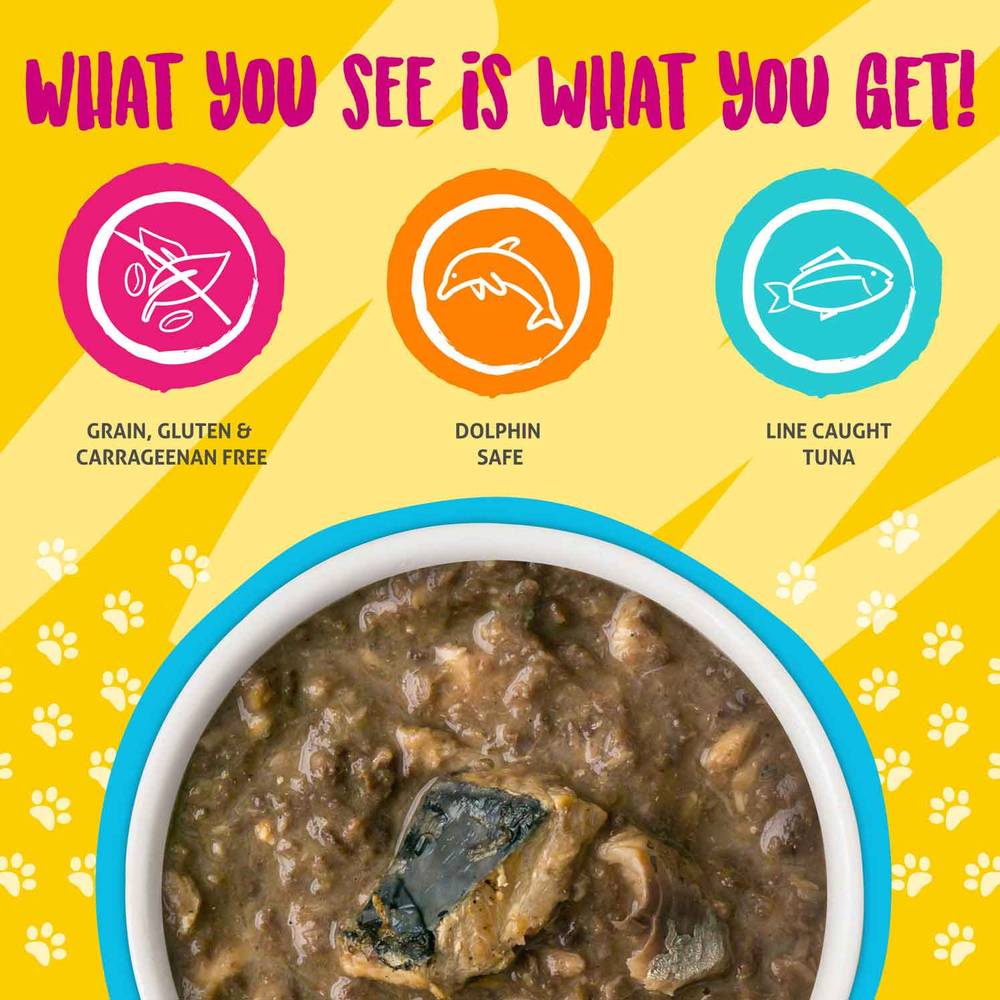Featuring hand-flaked off-the-bone wild-caught small sustainable fish|Minimally processed and FREE OF Grain, Gluten, GMOs, MSGs and any other bad stuff. That means NO corn, soy, wheat, or artificial colors or preservatives!|Complete and balanced diet for adult maintenance with added vitamins, minerals, and antioxidants. Low in ash, magnesium & phosphorus with proper moisture levels to promote a healthy urinary tract|These recipes all use small, sustainably sourced fish and are produced in human food facilities under the strictest B.R.C. Global standards for foods - Weruva, because Weluvya!|Weruva is a family owned company, wholly owned and operated by pet parents David and Stacie Forman Crude Protein (Min): 12%; Crude Fat (Min): 1.7%; Crude Fiber (Max): 1.0%; Moisture (Max): 82%; Ash (Max): 2.0%; Calcium (Max): 0.25%; Phos (Max): 0.25%; Magnesium (Max): 0.024%; Taurine (Min): 0.05%;