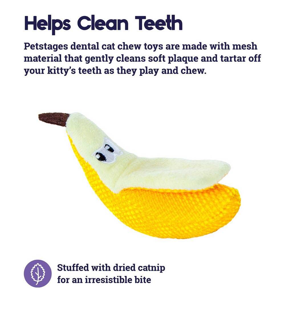 Catstages Dental Banana Cat Chew Toy with Catnip; Help give your pretty kitty a smile that matches with the Petstages Dental Banana Catnip Cat Toy. As your feline friend chews on the toy its mesh material works to floss and clean her teeth and gums to.