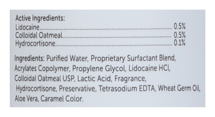 Ingredients: Active Ingredients: Lidocaine (0.5%), Colloidal Oatmeal (0.5%), Hydrocortisone (0.1%). Purified Water, Proprietary Surfactant Blend, Acrylates Copolymer, Propylene Glycol, Lidocaine HCI, Colloidal Oatmeal USP, Lactic Acid, Fragrance, Hydrocortisone, Preservative, Tetrasodium EDTA, Wheat Germ Oil, Aloe Vera, Caramel Color Contains: Wheat, Oat