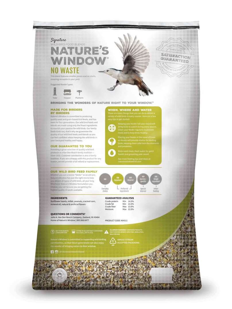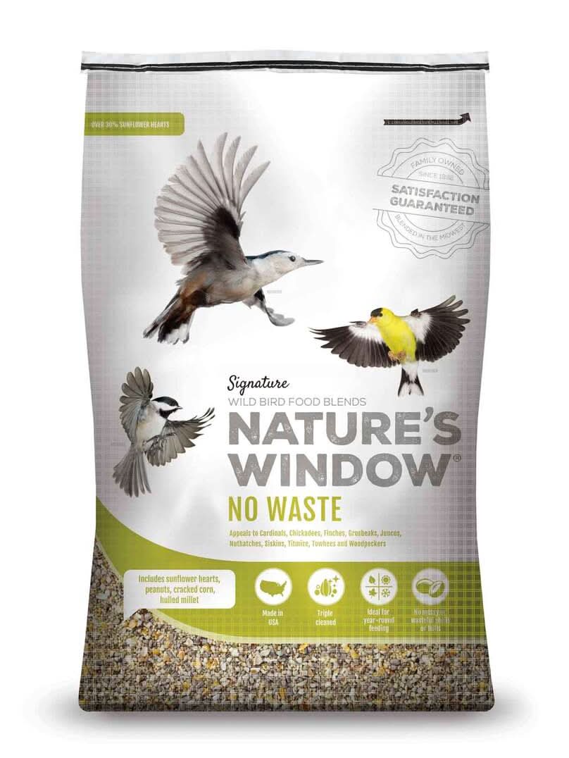 No Waste wild bird food blend features smaller pieces and no shells, meaning no waste in your yard.|No Waste contains a desirable ratio of sunflower hearts.|This formula also includes peanuts, cracked corn and hulled millet.|Appeal to a variety of wild birds, including cardinals, chickadees, finches, grosbeaks, juncos, nuthatches, siskins, titmice, towhees and woodpeckers.|Like all Nature’s Window blends, this one is free of wheat and fillers. Crude Protein – Min 14.5%, Crude Fat – Min 13.5%, Crude Fiber – Max 13.0%, Moisture – Max 12.0%